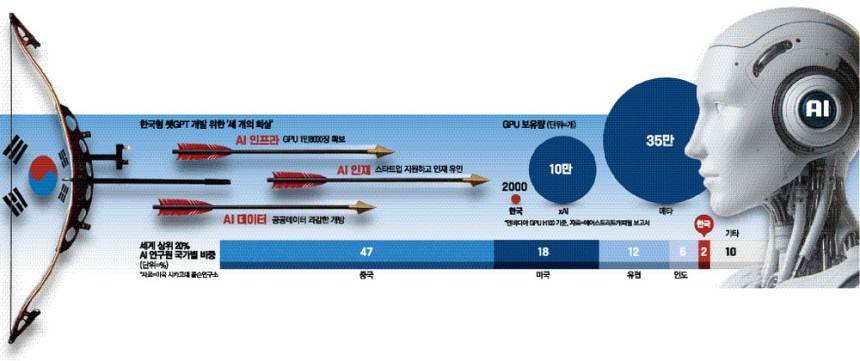 국가 AI위원회는 20일 ‘AI 컴퓨팅 인프라 확충을 통한 국가 AI 역량 강화 방안’을 발표했다. 이번 방안은 인공지능(AI) 산업을 육성할 때 ‘3가지 화살’을 모두 갖춰야 한다고 강조한다. 3가지 화살이란, AI인프라스트럭처, 효율적인 AI 알고리즘, 고품질 데이터를 의미한다. 이 3가지 화살을 한꺼번에 쏴 한국형 챗 GPT라는 과녁에 명중시키지 못할 시 한국은 글로벌 AI 경쟁에서 낙오될 수 밖에 없다고 예상된다.